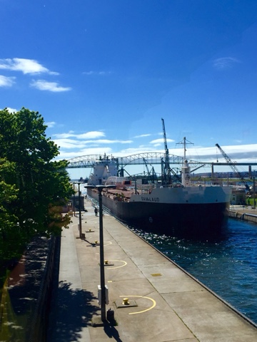 On Tuesday was an afternoon and evening off so we went to Saud St. Marie (pronounced "Soo") where there are some major locks to allow ships to pass between Lake Superior and Lake Huron. We got to see two 600 foot long cargo ships pass through. It's an amazing feat of engineering. Lake H. Is 21 feet lower than Lake Superior so you see the ship come into the lock and then be lowered 21 feet before it goes out again. I don't know why we didn't take the family there in 1993. It's also a quaint town and right on the Canadian border. Whitefish is the big locally caught fish there, so we had a bowl of whitefish chowder before going back to camp where Dad was doing a book signing along with some other authors at camp.